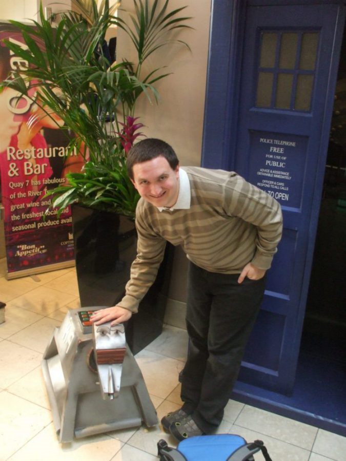 tim with k-9 ← Previous Next → Tim Bradley with K-9 standing outside the TARDIS at ‘Dimensions 2015’, Newcastle, October 2015
