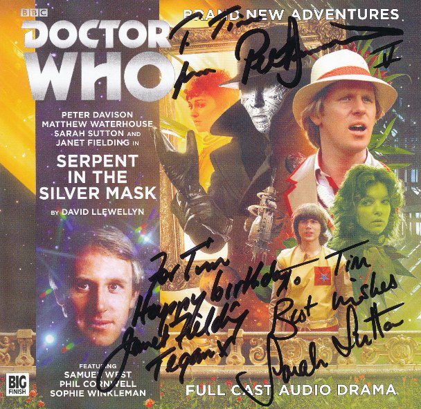 serpent in the silver mask signed by peter davison, sarah sutton and janet fielding ← Previous Next → Tim Bradley’s CD cover of ‘Serpent In The Silver Mask’ signed by Peter Davison, Janet Fielding and Sarah Sutton