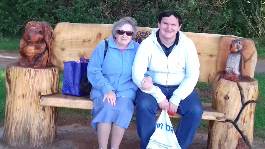 My Mum and me sitting on a bench at Caldey Island, September 2018