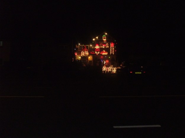 You can pick out various recognisable Christmas light shapes on that house. There’s a ladder with Santa climbing; there are some snowmen; more Santas; a Christmas stocking, etc. The picture quality in this photo isn’t very good I will admit, but it was dark that night as my parents and I walked home.