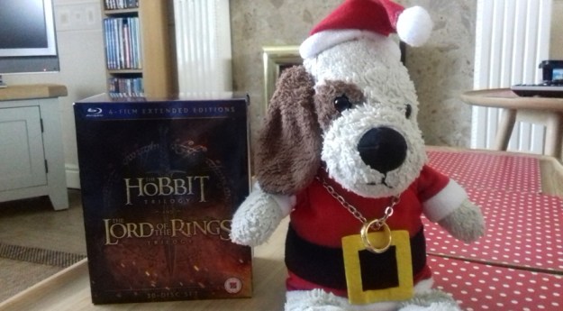 Oh no! Santa Cuddles is in trouble! He’s obsessed with the One Ring like Gollum was in ‘The Lord of the Rings’! Here he is with the One Ring around his neck, sitting next to ‘The Hobbit’/’The Lord of the Rings’ Blu-ray box set. That includes the extended editions of the 6 films featured in the box set.