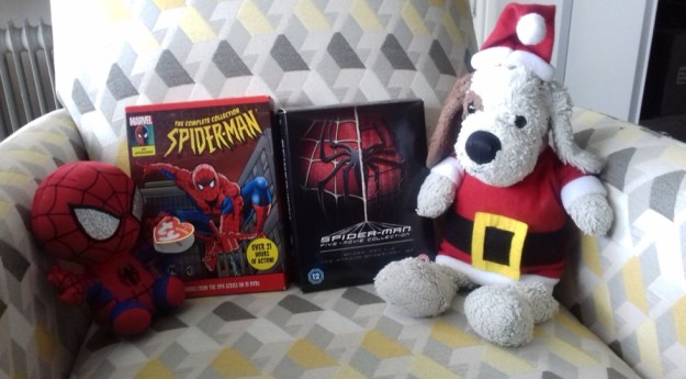 Santa Cuddles certainly is, along with Spider-Baby! Here they are with the DVD collection of ‘Spider-Man: The Animated Series’ from the 1990s as well as the Blu-ray collection featuring the original ‘Spider-Man’ trilogy with Tobey Maguire and ‘The Amazing Spider-Man’ films with Andrew Garfield.