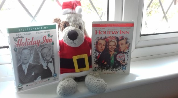 And no, I’m not talking about the film ‘White Christmas’. I’m talking about the film ‘Holiday Inn’, starring Bing Crosby and Fred Astaire, which has the song ‘White Christmas’ by Irving Berlin in it. Here’s a photo of Santa Cuddles with two DVD releases of the film ‘Holiday Inn’ that I love watching.