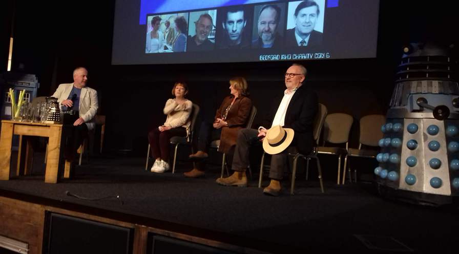 4. panel bedford who charity con ← Previous Next → Simon Danes with Janet Fielding, Sarah Sutton and Peter Davison at ‘Bedford Who Charity Con 6’, October 2021