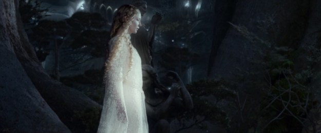 During the night, Frodo wakes up to be summoned by Galadriel who walks by.