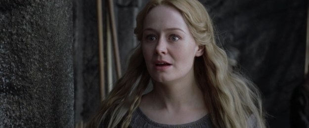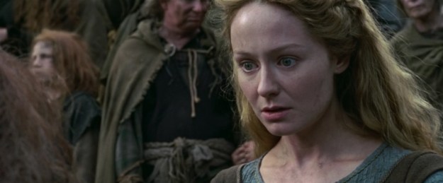 At Helm’s Deep, Éowyn rushes down to meet with Théoden and company who have returned from their battle with the warg riders. Éowyn looks about.