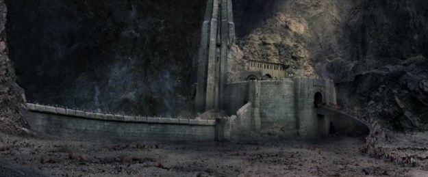 A short while later, Aragorn struggles to push open the doors to Théoden’s throne room at Helm’s Deep. After pushing a couple of times, Aragorn manages to push his way through the doors, but ends up on the floor in the process. Théoden looks down on him.