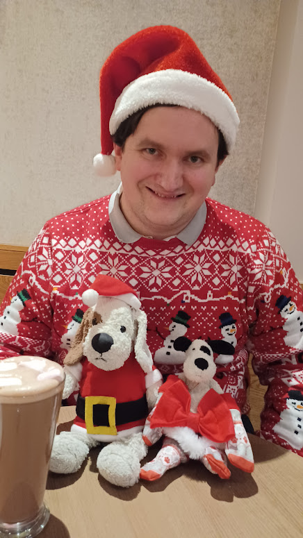 Recently, I went to see limited re-releases of two Christmas films at my local Showcase Cinema in Nantgarw. They were limited re-releases of ‘Home Alone’ and ‘Elf’. I saw ‘Elf’ yesterday on Christmas Eve. 🙂 Here’s a photo of me in my red Christmas pullover enjoying a cup of hot chocolate and marshmallows with Santa Cuddles and his friend Buggles, also in Christmas gear, joining me. 😀