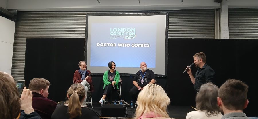 26 ← Previous Next → Andrew Cartmel, Jessica Martin and Jeff Cummins on the ‘Doctor Who Comics’ panel talk at the ‘London Comic Con Winter 2024’, November 2024
