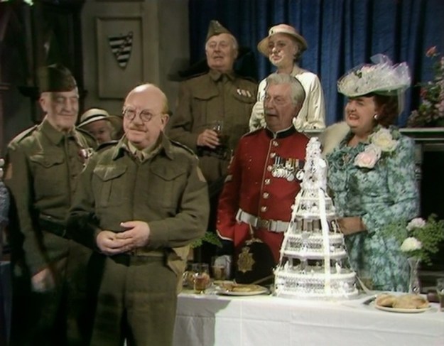Mrs. Pike gets to be the matron of honour at the wedding for Mrs. Fox whilst Captain Mainwaring gets to give Mrs. Fox away at the ceremony. Jonesy dresses up in his red regimental uniform and Wilson dresses up in his old First World War captain’s uniform to be Jonesy’s best man at the wedding.