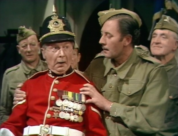 Jonesy is the one who gives the sword to Mainwaring instead of Frazer, though he hasn’t used it to make toast apparently. Godfrey is the one who suggests placing the union flag up on the wall instead of the door like Pike suggested in the TV episode. Mainwaring still hears Walker make the joke on it.