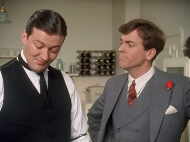 Anyway, Bertie returns home with a hangover from the previous night of stealing the policeman’s helmet before he meets his new valet, Stephen Fry as Jeeves. Jeeves assists Bertie out of his hangover.