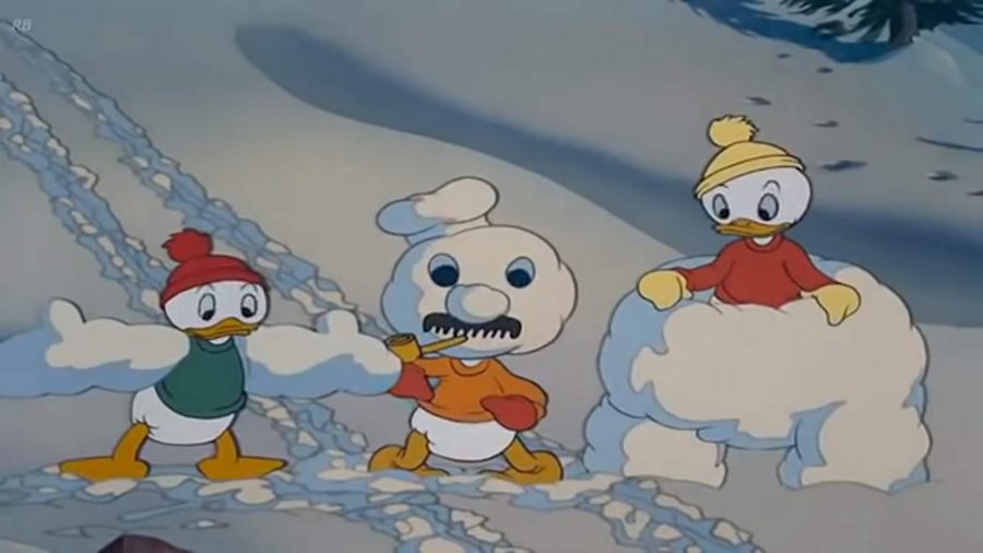 It is funny how Donald wanted to enjoy the snow outside, singing ‘Jingle Bells’ as he pulled his sled up the hill before he got into mischief with his three nephews Huey, Dewey and Louie. Donald ruins their snowman once he smashes through it with his sled. He laughs away rolling about in the snow.