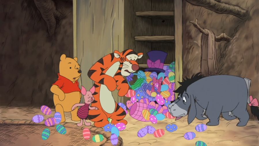 With that said, Pooh does get to have his own song in the film, where he inhales dusts and sneezes violently whilst spring-cleaning Rabbit’s house. Pooh’s violent sneeze causes the box containing Rabbit’s Easter ornaments to be knocked down from a very high shelf.