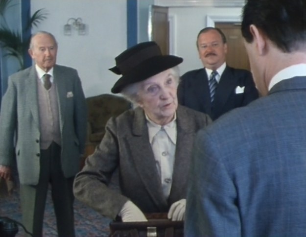 There’s also Gwen Watford as Mrs. Bantry, who is a close friend and neighbour to Miss Marple. I like how she seems convinced Miss Marple has solved the murder mystery case already before starting.