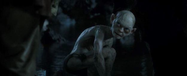 Beforehand, Bilbo picked up a gold ring on the way. He hides it from Gollum when he meets up with him. Very soon, Bilbo gets into a game of riddles with Gollum, which I enjoyed watching. This is so he can find a way out of the mountains. Bilbo cheats by asking Gollum, “What have I got in my pocket?”