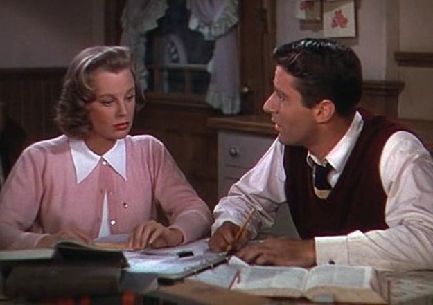 When Tommy gets nowhere with Pat, he tries to study French which is a language she’s most interested in. Tommy gets help from part-time school librarian Connie Lane, played by June Allyson, to enlist studying French. Gradually, Tommy falls in love with Connie before he’s entangled with Pat.