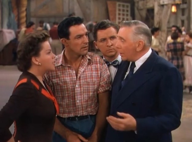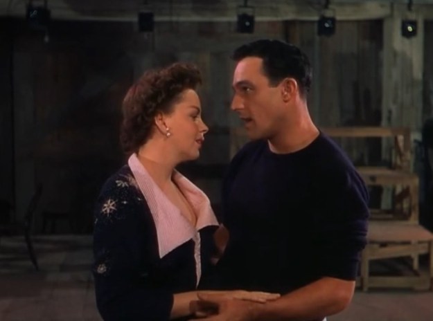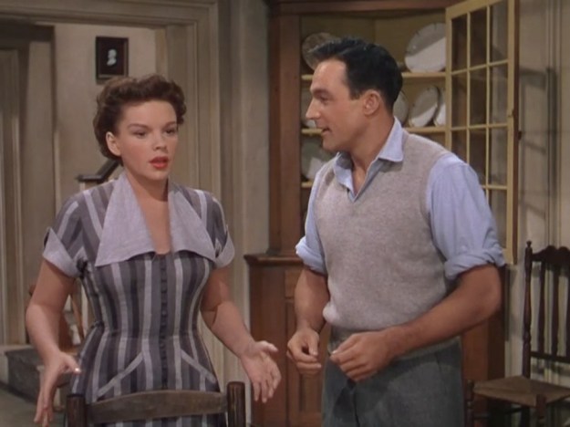 Meeting Gene Kelly as Joe Ross, the director of the theatre play the troupe are performing and Abigail’s fiancée, Jane and her housekeeper Esme reluctantly agree to let them use their barn to rehearse. But only on the condition that they help out once and while in doing chores on the farm. 🙂