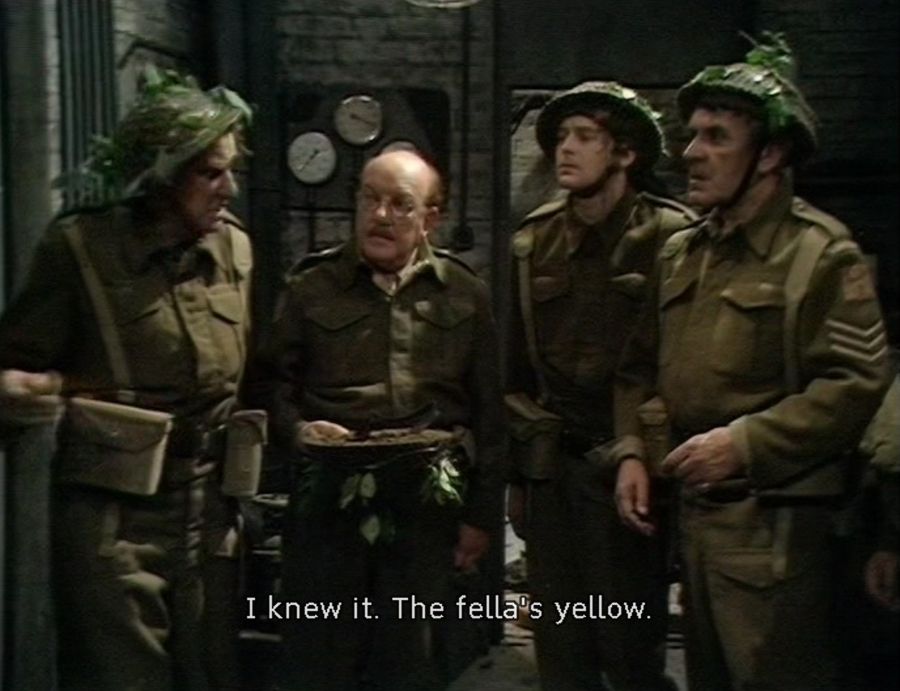 Incidentally, I thought it was ‘yella’ nor ‘yellow’ when it came to calling someone a ‘coward’. That’s how it was spelt in a script when I did in a school play in Year 7 in 2001. Although when Private Frazer in ‘Dad’s Army’ said it, it is spelt in ‘yellow’ in the DVD subtitles.