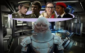 The Zygons surround the Fourth, Sixth, Eighth and Ninth Doctors and their friends.
