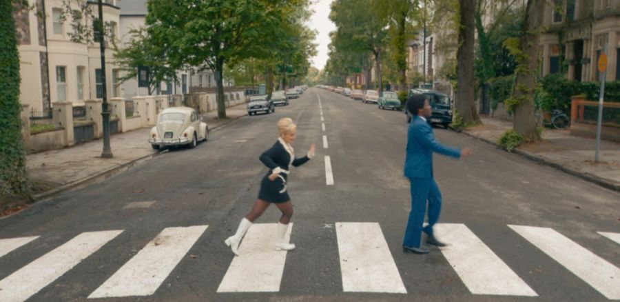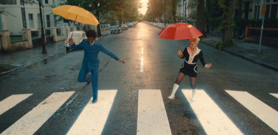 After the dance number is finished, the episode ends with the Doctor and Ruby returning to the TARDIS and they dance along Abbey Road with umbrellas. The zebra crossing on Abbey Road reacts to the Doctor and Ruby’s footsteps as if they were playing a keyboard.