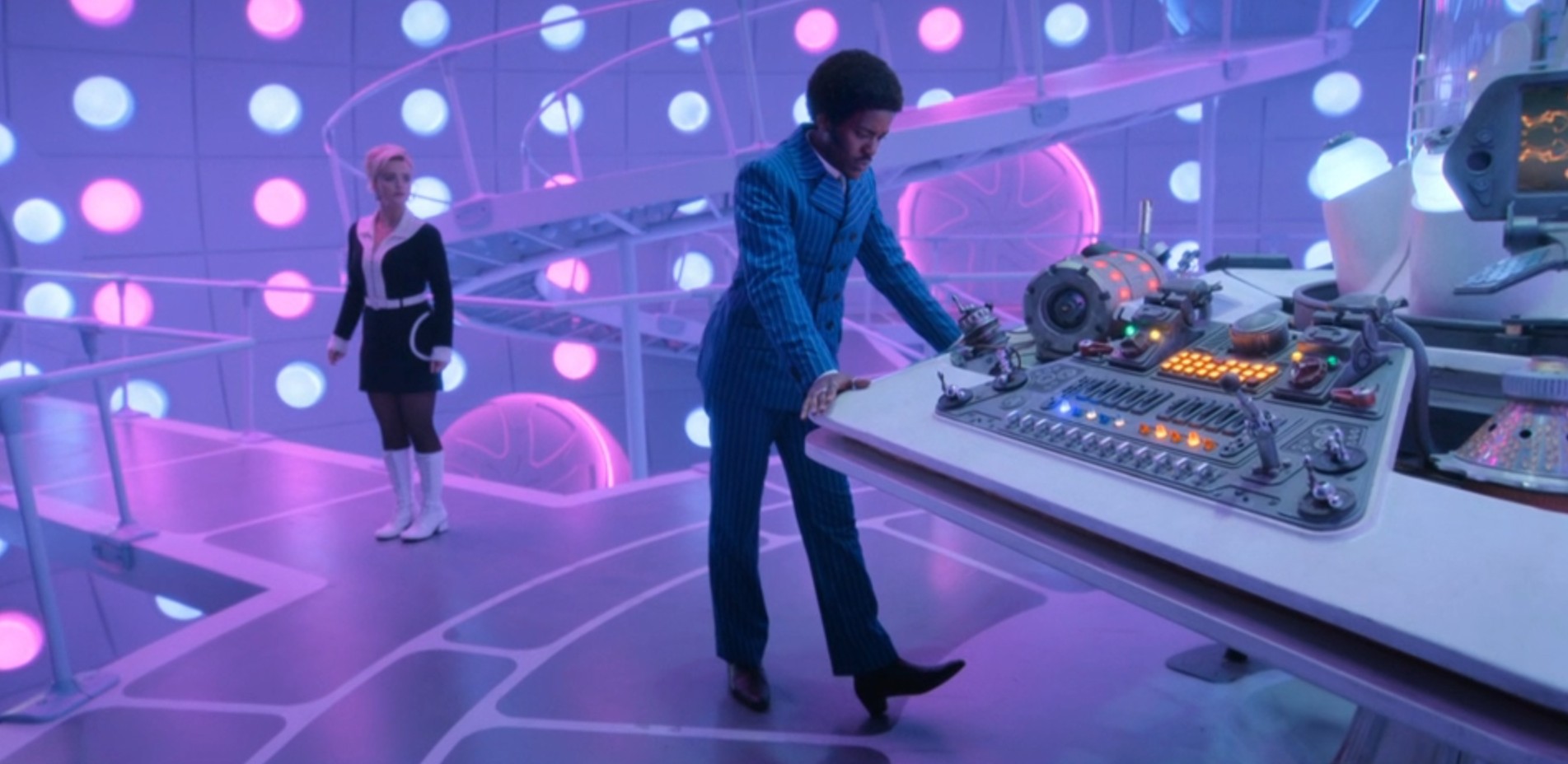 They’re then interrupted by Maestro, who happens to find them in the alternative 2024. They summon a piano and they transport the Doctor and Ruby elsewhere. Also, Maestro has a change in costume compared to the piano lapel one that they were wearing in 1963.