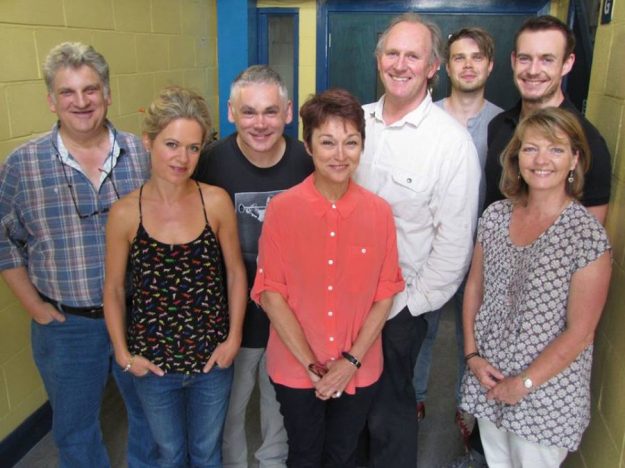 The cast of ‘Iterations of I’. From left to right: Teddy Kempner, Sinead Keenan, Matthew Waterhouse, Janet Fielding, Peter Davison, Joseph Radcliffe, Andrew Macklin and Sarah Sutton.