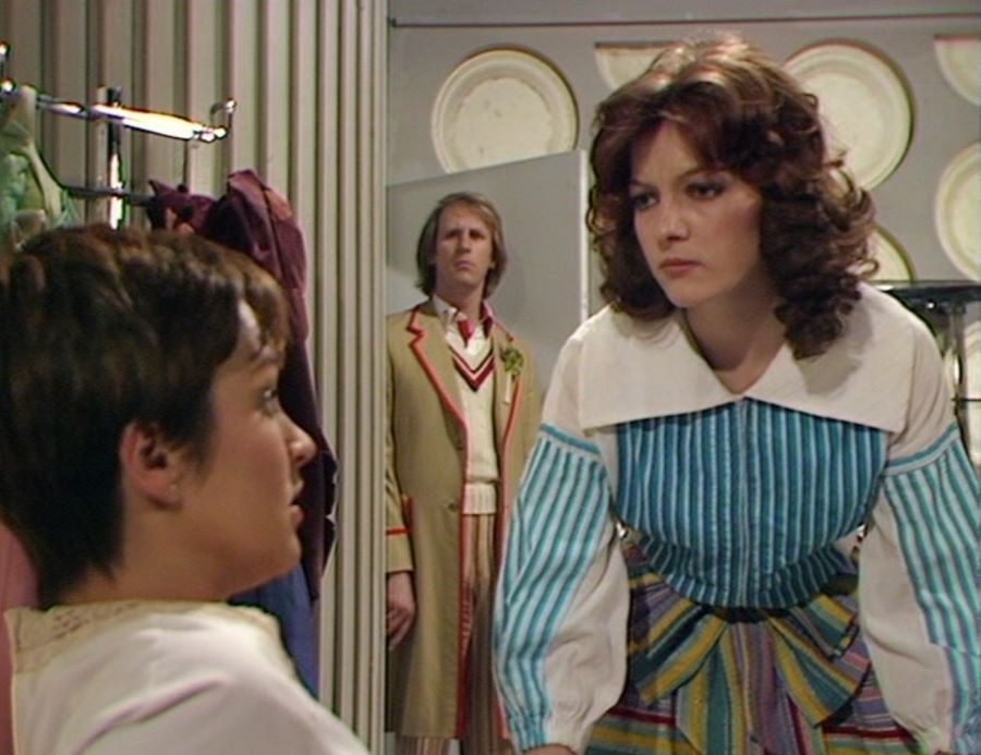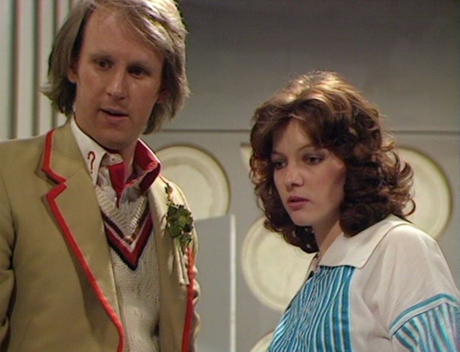 And then there’s the new blue stripy dress that Nyssa wears. Not many people like that dress. 😐 Peter Davison certainly doesn’t. He described Sarah Sutton looking like a waitress from McDonald’s. His then-wife Sandra Dickson described her as a ‘walking deckchair’. 😀