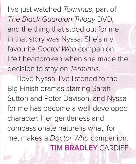 I’m amazed my letter about Nyssa got featured in the ‘Galaxy Forum’ of one issue of ‘Doctor Who Magazine’ after watching ‘Terminus’ a month later. It was a happy time for me and it prompted me to write to Sarah Sutton and then go to the conventions to meet her. Glad you like my comment being featured in DWM.