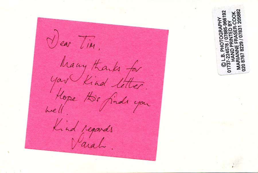 It’s what sparked off my interest to go to conventions afterwards, especially as I wrote to Sarah Sutton after seeing my ‘DWM’ letter about Nyssa in ‘Terminus’ in print. I received two photos from her in the post, including one that had a nice pink posit note attached.