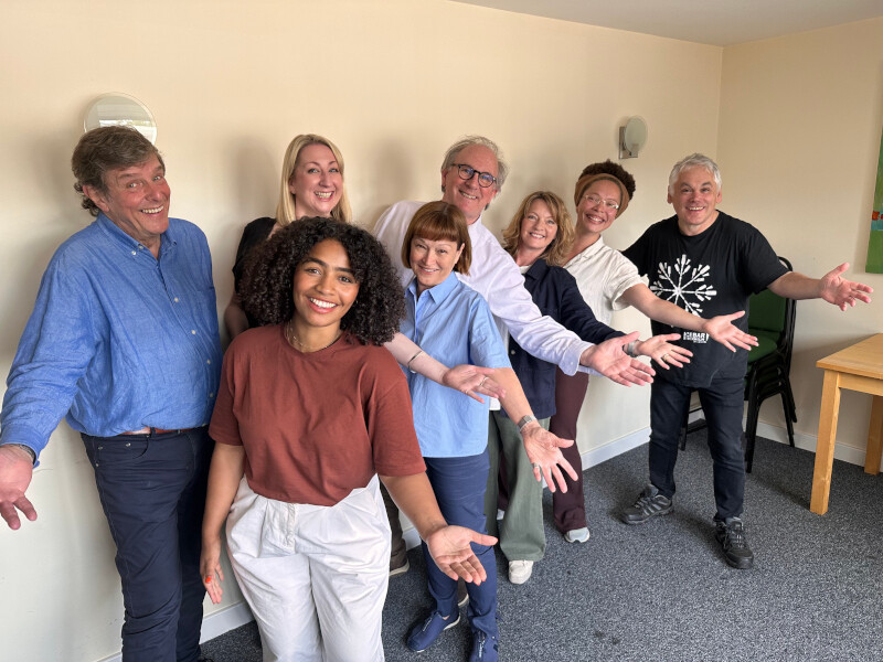 The cast of ‘The Great Beyond’. From left to right: Philip Hurd-Wood, Maggie Service, Anna Crichlow, Janet Fielding, Peter Davison, Sarah Sutton, Paksie Vernon and Matthew Waterhouse.