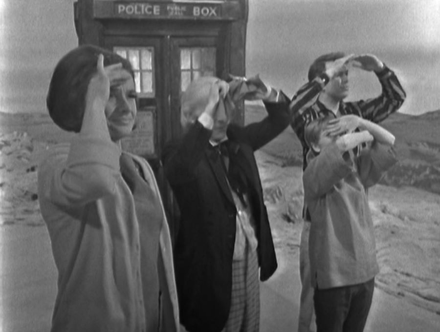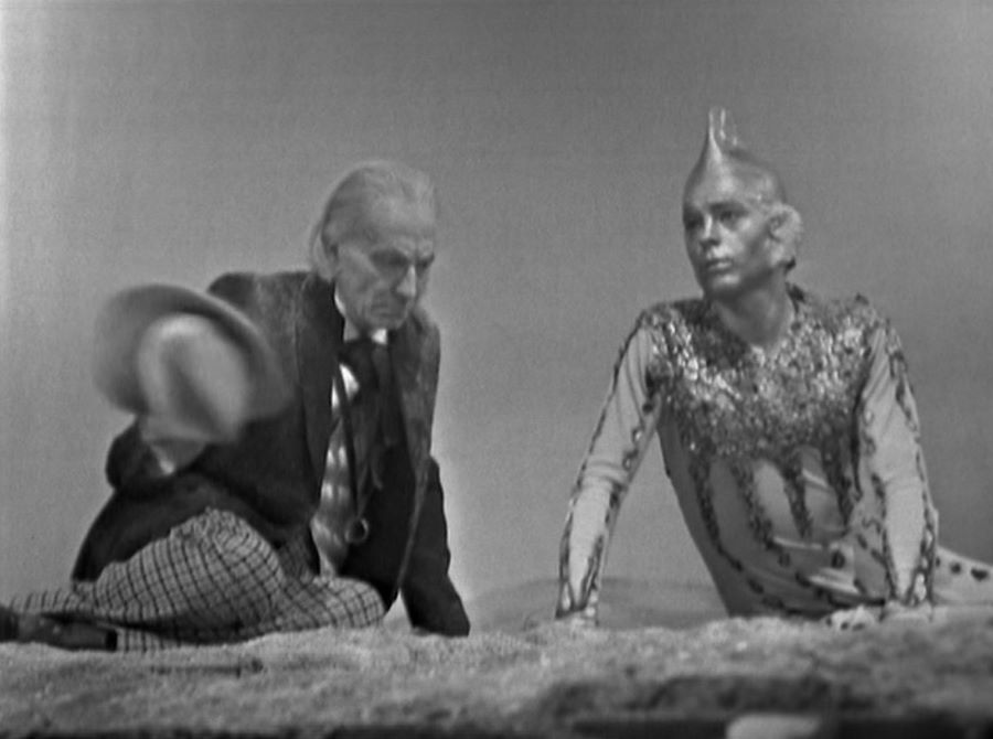 Now that’s out of the way, let’s continue. 😀 Ian follows Vicki when she’s eager to explore the desolate planet whilst Barbara and the Doctor remain behind at the TARDIS and enjoy some sunbathing. It was very funny when the Doctor sang away while sunbathing and Barbara soon asked,