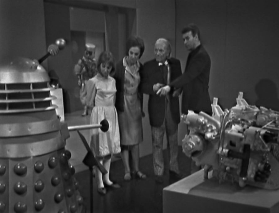 As well as a Dalek shell on display, the Doctor, Ian, Barbara and Vicki soon come across themselves and the TARDIS on display. Eventually, time catches up to our heroes and the exhibits of themselves and the TARDIS vanish. But they have to avoid creating their ill-fated future whilst in the museum. 😐