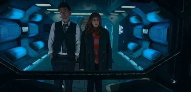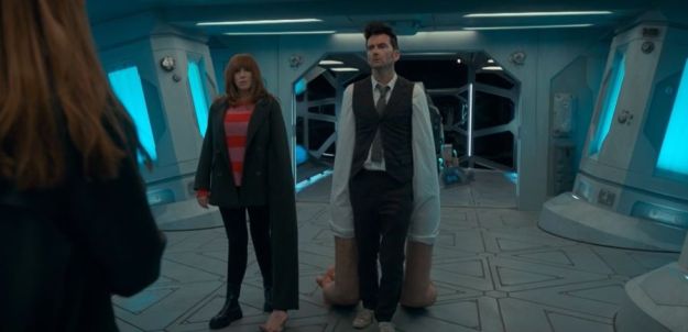 Thankfully, that didn’t happen, as once the final number ‘Tacsladia’ is declared and the robot pushes the button to cause the explosion, the Doctor works out that Not-Thing Donna is not the real Donna, as her arms are slightly too long. He ejects her back into the spaceship and the real Donna rushes in.