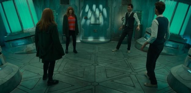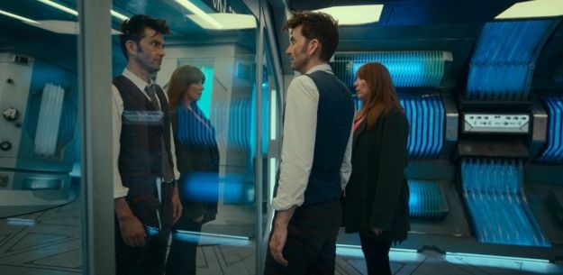 In fact, the Doctor with Donna in the filament room complains that his arms are too long and so does Donna with the Doctor in the spindle room. Our Doctor and Donna have been interacting with doppelgängers aboard the ship. I admit, that was quite a surprise when I watched it in the special. 🙂