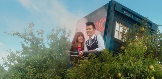 The Doctor and Donna hug each other as the TARDIS dematerialises, whilst the Not-Thing Donna and the Not-Thing Doctor are caught in the flames of the exploding ship. The Doctor and Donna travel back to London, reflecting on the adventure they’ve had and what could have been done differently.