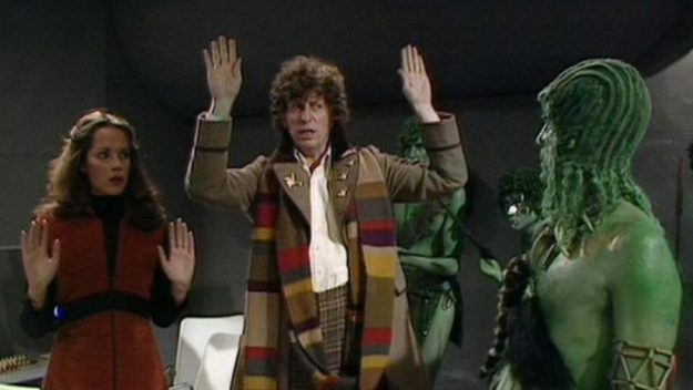 Yes I liked Tom Baker’s moments in this story, especially when he discovered the Swampie, dressed as a monster with a clam on his head, about to kill Romana. Also when he shatters glass with his high-pitched whine was very good.