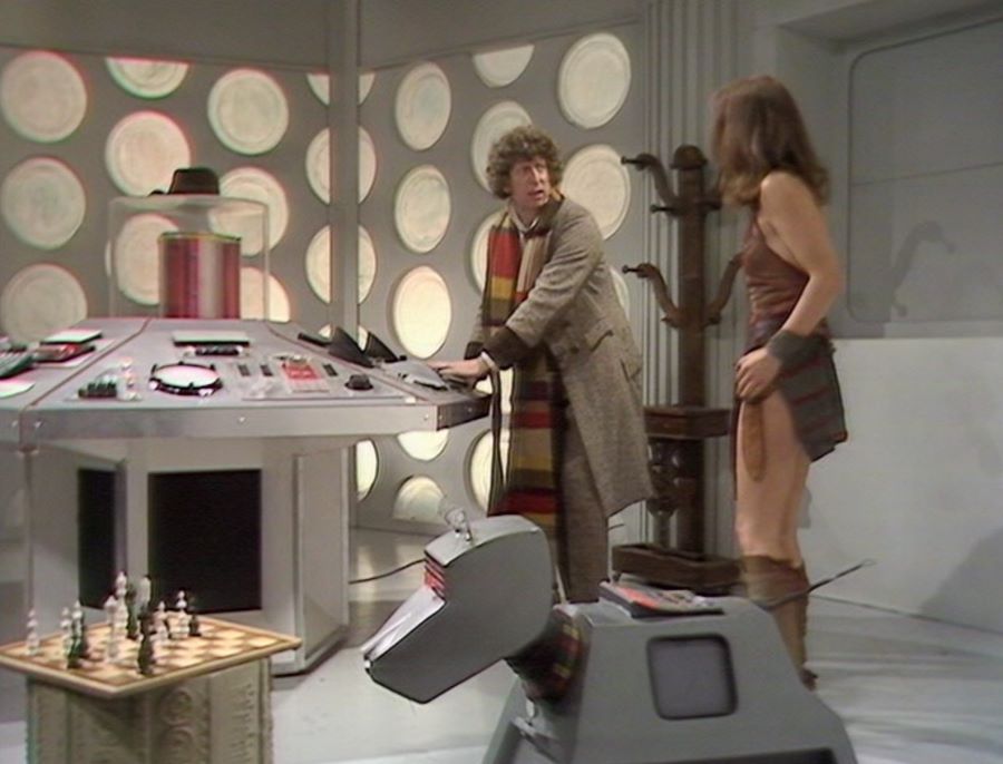 The Doctor hasn’t got himself a special dog whistle for K-9 by this point in the series. 😀 It’s funny when the story begins with K-9 playing chess with the Doctor and Leela in the TARDIS. K-9 manages to beat the Doctor in the game, to which the Time Lord is outraged by. He later becomes dismissive of K-9. 😐