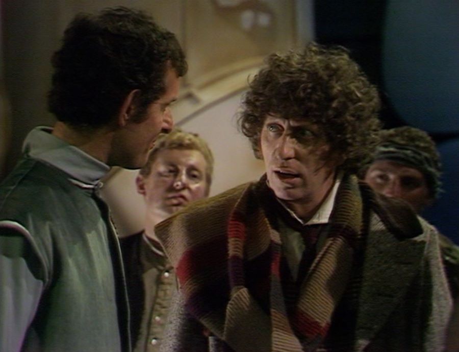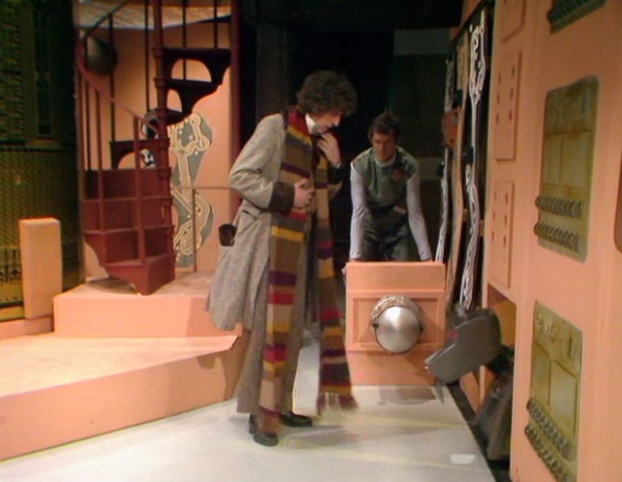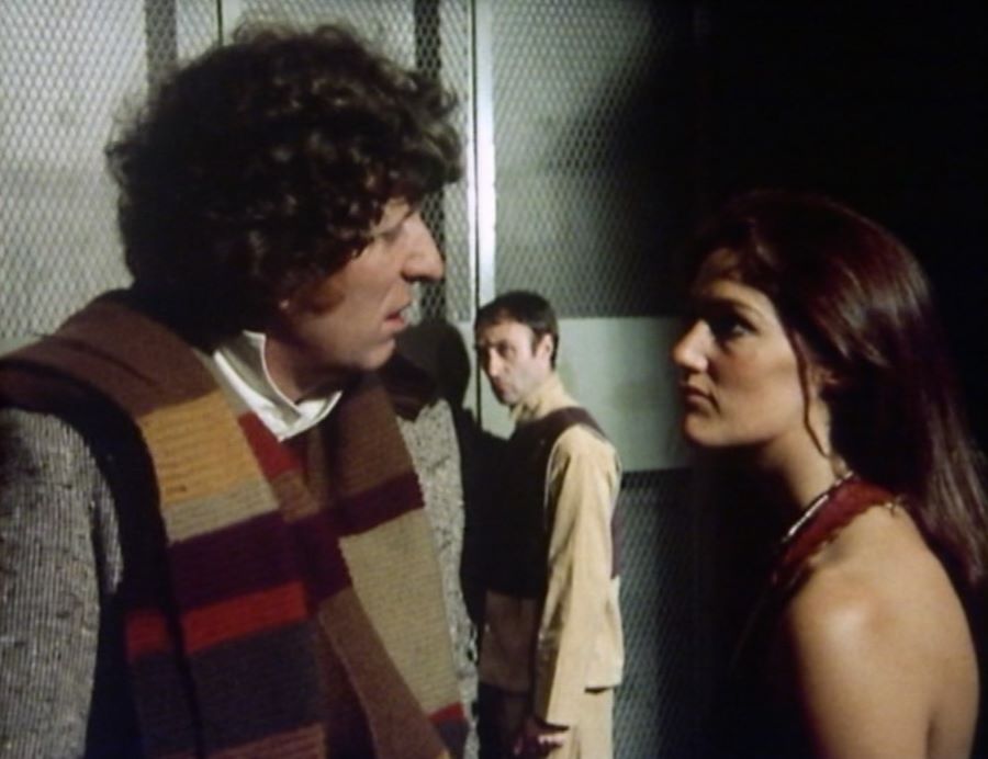 Incidentally, it’s supposed to be sunny outside on the rooftop, whereas when filming on the location, it was actually freezing cold. Again, I feel for Louise Jameson for having to wear that savage outfit in those inclement conditions. Fortunately, Tom Baker wrapped her up warm in his scarf between takes.