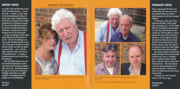 The CD extras are as follows. After ‘Trail of the White Worm’, there’s a trailer for ‘The Oseidon Adventure’ with Tom Baker and Louise Jameson. There are also some behind-the-scenes interviews with the cast and crew, including interviews with Tom Baker, Louise Jameson, Geoffrey Beevers, Michael Cochrane, director Ken Bentley, etc. After ‘The Oseidon Adventure’, there’s a trailer for the second season of ‘The Fourth Doctor Adventures’ with Tom Baker and Mary Tamm. There are also some behind-the-scenes interviews with the cast and crew, including Tom Baker, Louise Jameson, Geoffrey Beevers, etc.