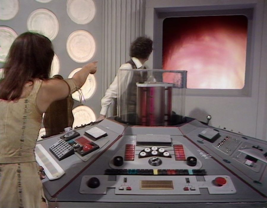 Gosh, the Bristol Boys are busy. 😀 In ‘Underworld’, the Fourth Doctor is painting (Painting what exactly, I don’t know) and Leela is playing around the console for a bit. The TARDIS reaches the edge of the cosmos, which is all black, and K-9 informs the Doctor and Leela that there’s a spacecraft nearby.
