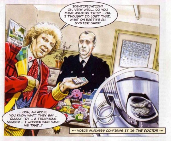 Later, the Sixth Doctor and Peri visit the Gogglebox inside Earth’s moon. It’s like an outer-space Google on Earth’s history. Peri wants to see what’s happened to her family. When she discovers her best friend’s dad has been murdered, Peri is upset and demands the Doctor to take her back home.