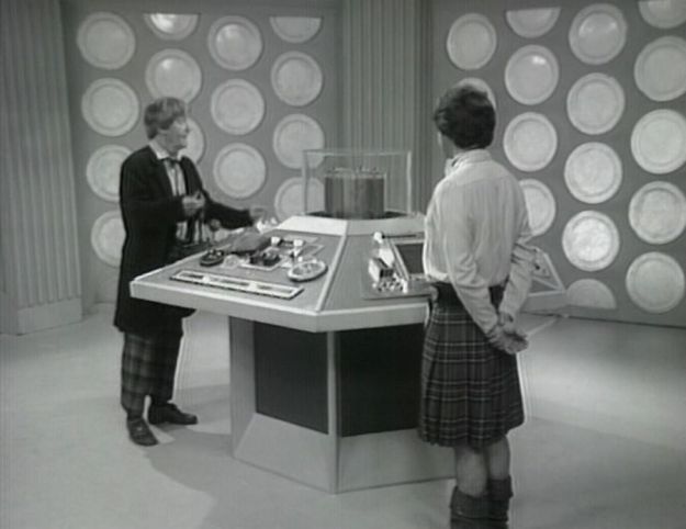It looks like the TARDIS console that belonged to the Fourth Doctor in Season 18 and to the Fifth Doctor in Season 19. We’ll get back to more continuity issues of this kind later on. There’s also the quick innuendo between Jamie and the Doctor, improvised by Frazer Hines and Patrick Troughton. 🙂
