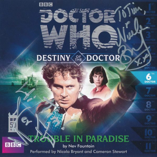 destiny of the doctor6 trouble in paradise signed by nicola bryant and nev fountain ← Previous Tim Bradley’s CD cover of ‘Trouble In Paradise’ (DOTD) signed by Nicola Bryant and writer Nev Fountain. Like Loading...