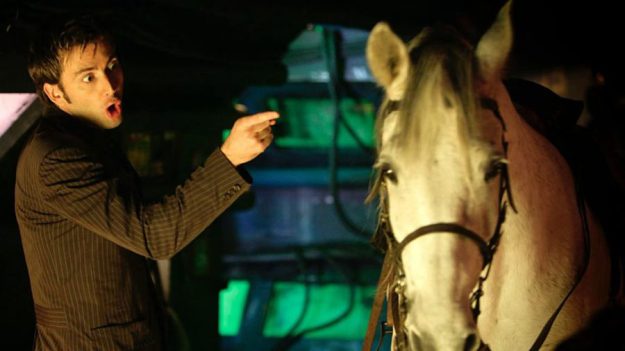 There’s a horse that appears in this episode who the Doctor names Arthur. David Tennant gets to ride on horseback when crashing through a wall to save Reinette from the Clockwork Droids before they kill her at the ball in Versailles.