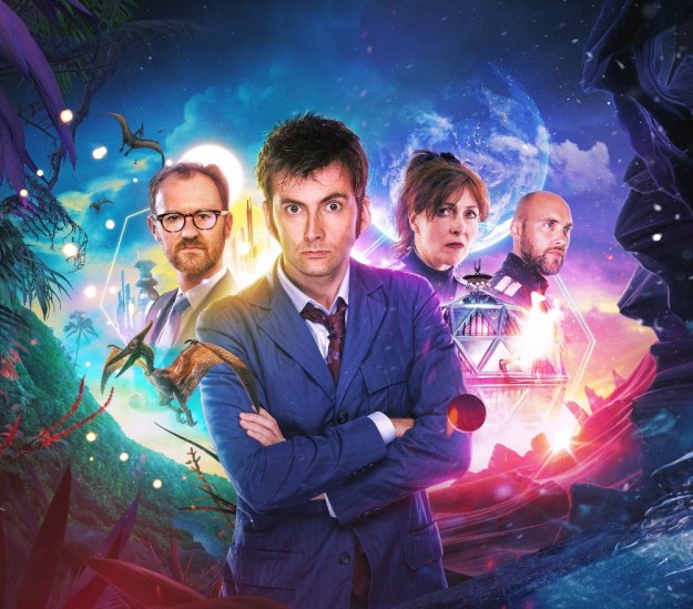 Mechanoids and Vargas with the Tenth Doctor, Anya and Mark