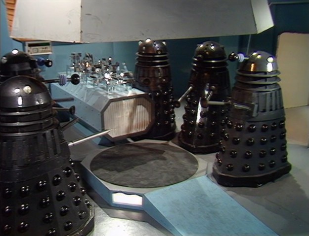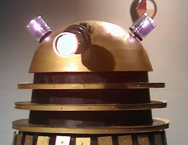 The Daleks are described as ‘silver’, not ‘grey’ in the Target novelization. Honestly, I prefer the Daleks being ‘silver’ or ‘bronze’ as opposed to ‘grey’ or ‘dark black’, since it makes them stand out more. Plus, it matches pretty well to the 1960s design they originally had.
