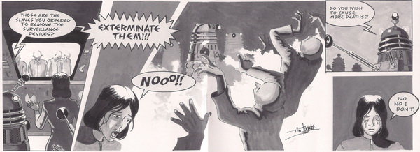There’s a moment in the episode (and it’s in the comic book art of the CD notes), where the Daleks exterminate the slave workers who removed the surveillance devices in her office. It’s a horrific moment and it upsets Suz when she realises that she can’t control the Daleks as she thinks she can.