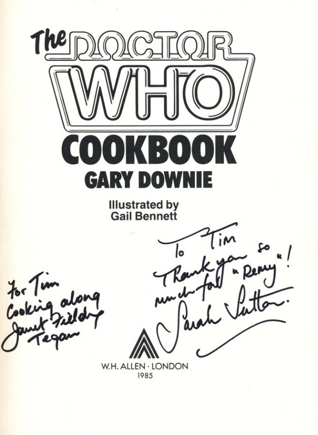 I leave you now with a special ‘Doctor Who’ recipe that I’d like to add to the cookbook. Enjoy, and as Janet Fielding wrote when she signed the cookbook for me, get ‘cooking along’! 😀