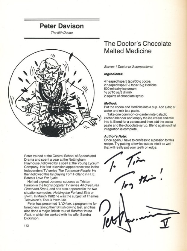Finally, we have the ‘Drinks’ section. This contains The Doctor’s Chocolate Malted Medicine recipe by Fifth Doctor actor Peter Davison. 🙂 Peter wrote “Try this!” when he signed his Chocolate Malted Medicine recipe in my copy of the cookbook at ‘BWCC6’ in 2021. I hope I will try out his recipe soon.